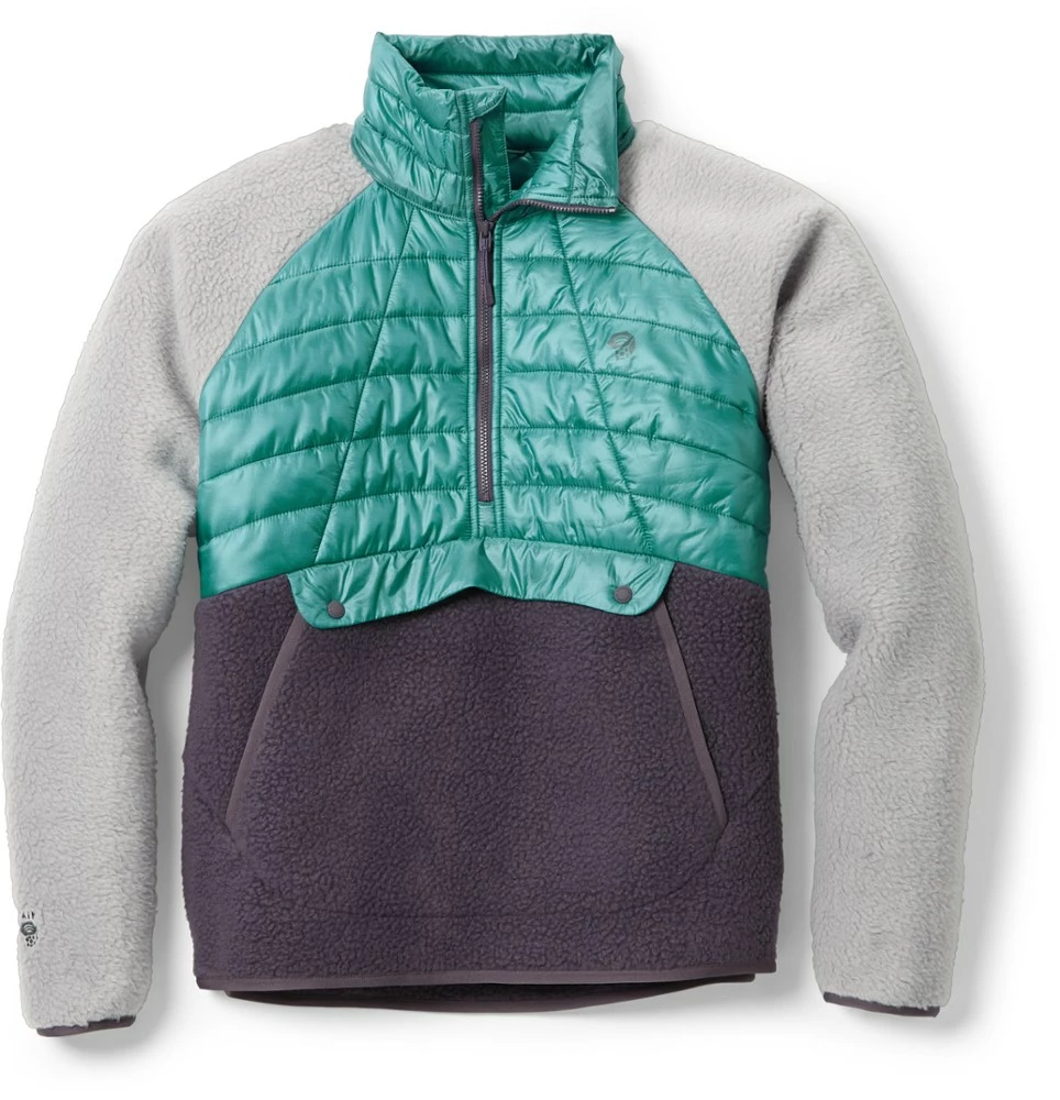 An ideal before-and-after layer for cold winter days apres ski or around town, the women’s Mountain Hardwear Altius Hybrid pullover has baffled synthetic fill and high-loft sherpa fleece for coziness.